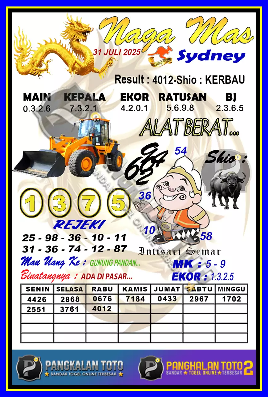 Bagian pertama dari sajian ini adalah tabel yang menunjukkan urutan hari dalam seminggu: Snin, Slsa, Rbu, Kmis, Jmat, Sbtu, Mggu. Di bawahnya, tersaji serangkaian angka yang merupakan data historis atau potensi keluaran. Angka-angka ini, seperti 4663, 7494, 0419, 7455, 2562, 4277, 7376, dan seterusnya, dapat menjadi bahan analisis awal bagi para pemain yang terbiasa mengolah data historis untuk menemukan pola atau tren. Pengamatan terhadap angka-angka ini, terutama dalam kaitannya dengan hari pengeluaran, dapat memberikan petunjuk awal mengenai angka-angka yang memiliki kemungkinan muncul lebih tinggi.